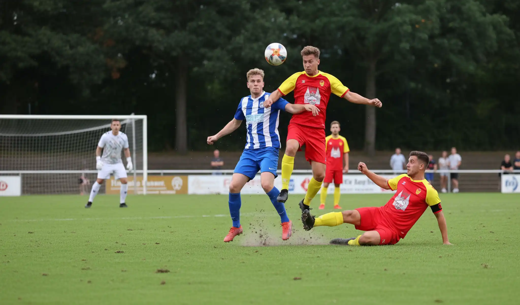 3. Herren in roten/gelben Trikots, Torwart weiß, Trainer rechts auf Rasen