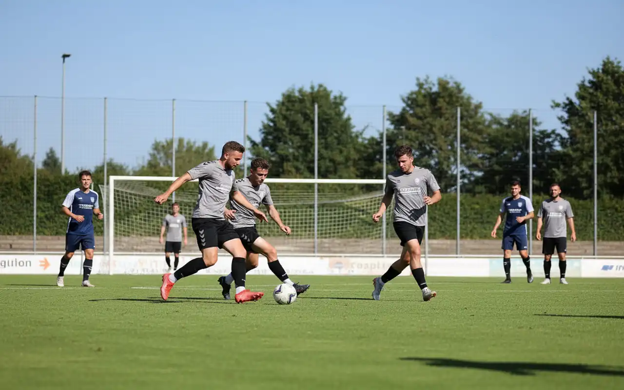 Männer-Fußballteam in grauen Trikots, Torwart in gelb, Gruppenfoto vor dem Tor